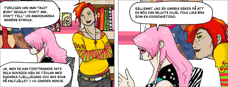 Posted on 15 september 2011 by Torbjörn Jerlerup Den 20/9 försvinner ”Don´t Ask, Dont Tell” regeln! Humor, Nyheter Vi läser i nyheterna att den 20/9 försvinner ”Dont Ask, Dont Tell” regeln i USA:s försvar. Detta betyder att öppet homosexuella får bli militärer. (Med tack till tecknaren Mim Sörensson.) Dela:TwitterFacebookGoogle +1MerLinkedInPocketTumblrPinterestE-postSkriv utVi läser i nyheterna att den 20/9 försvinner ”Dont Ask, Dont Tell” regeln i USA:s försvar. Detta betyder att öppet homosexuella får bli militärer. (Med tack till tecknaren Mim Sörensson.)
