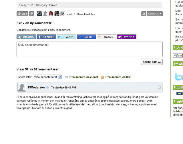 Även kommentarsfälten är fulla med kommentarer som förespråkar tortyr och mord, som inte modereras bort av PI:s moderatorer. Bara får att ta ett exempel från i fredags, skrivet av signaturen Ubbelfarsta (den handlar om utvisningen av en person från Sverige):