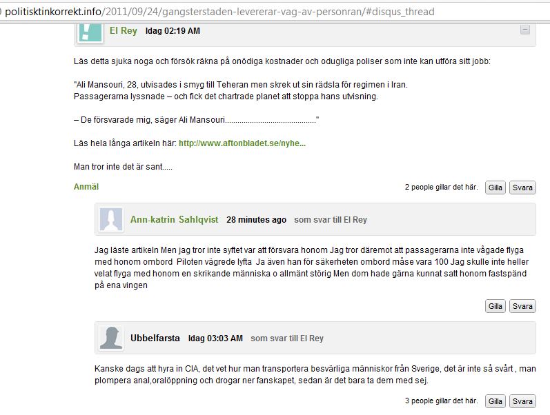 Kanske dags att hyra in CIA, det vet hur man transportera besvärliga människor från Sverige, det är inte så svårt. man plompera anal.oralöppning och drogar ner fanskapet, sedan är det bara ta dem med sej. (Källa)