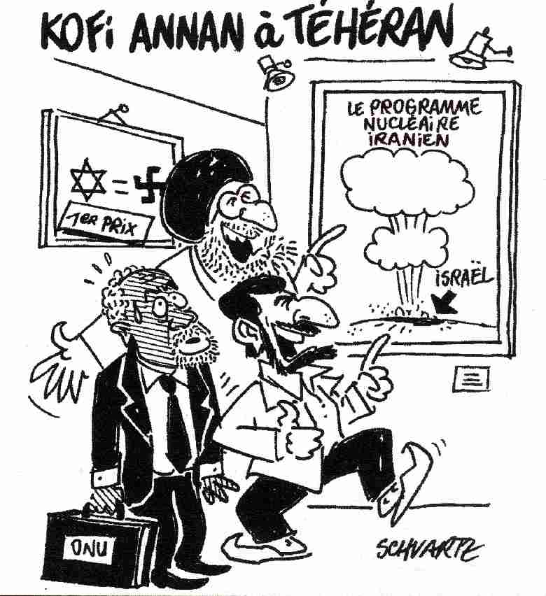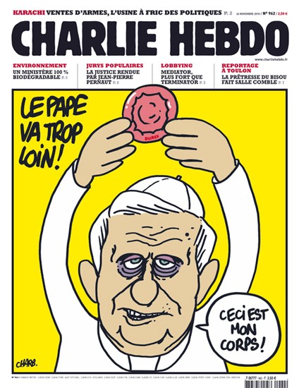 Och till sist några prov på skämtteckningarna i tidskriften. En om Iran och en annan om påven. (Tidskriften har skämtat mer om påven än om muslimerna genom åren.)