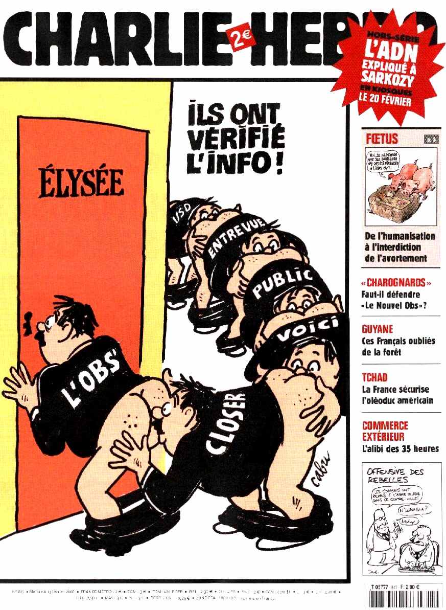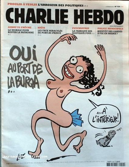 2007: Som svar på att religiösa fundamentalister av alla sorter ogillade Charlie Hebdo: Figurerna på bilden säger:"Charlie Hebdo måste bära slöja"