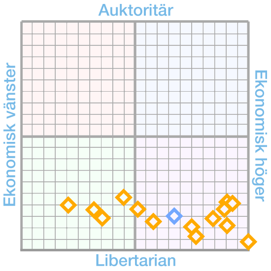 På sidan Medarbetare kan du numera inte bara läsa om oss utan också se våra resultat från Political Compass. Testet är förstås inte någon absolut sanning och frågorna är till viss del öppna för tolkning, men det kan ändå ge dig en fingervisning om hur vi förhåller oss till verkligheten och till varandra. Kom också ihåg att vi alla kallar oss liberaler, ibland med prefix eller andra extraord för att närmare precisera våra ståndpunkter.