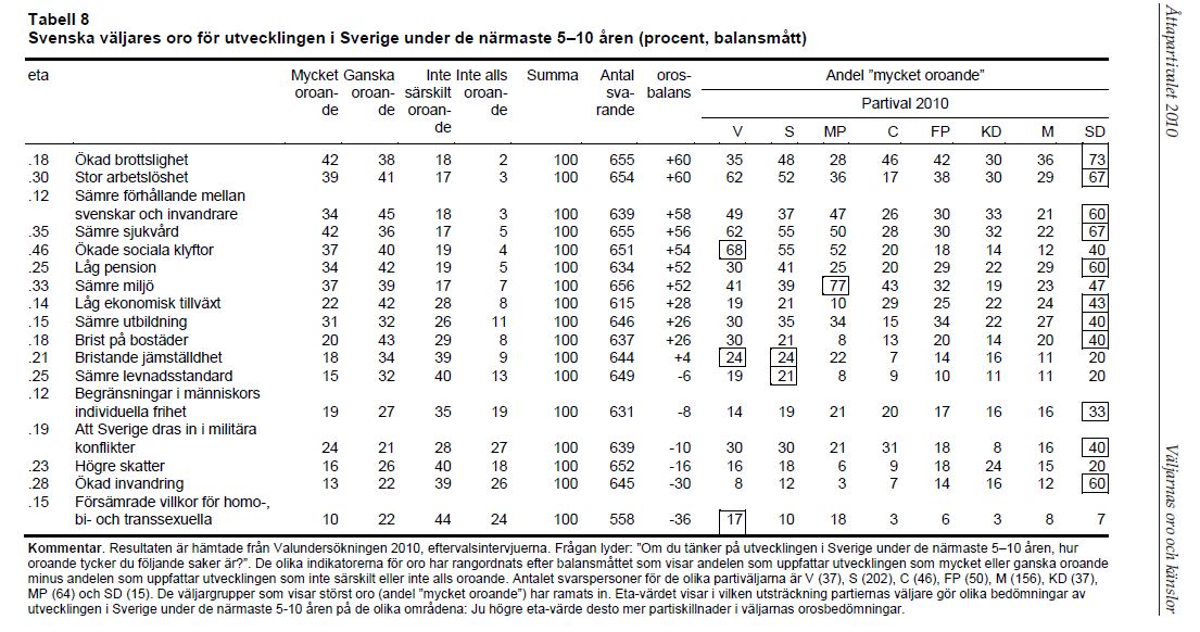Olika väljargrupper oroar sig inte för samma saker. Det finns tydliga skillnader i hur de olika partiernas väljare bedömer hur oroande olika saker är. Det är få sverigedemokrater som intervjuats (n=15) men det förefaller tydligt att SD-väljarna genomgående känner större oro än andra partiers väljare när de tänker på utvecklingen under de kommande 5–10 åren. Det gäller inte bara på de områden som ligger nära de frågor som Sverigedemokraterna lade tonvikt på i valrörelsen, såsom ökad invandring (60 procent ”mycket oroande”), ökad brottslighet (73 procent) och låga pensioner (60 procent). För 11 av 17 orosområden tillhör SD-väljarna de mest oroade…