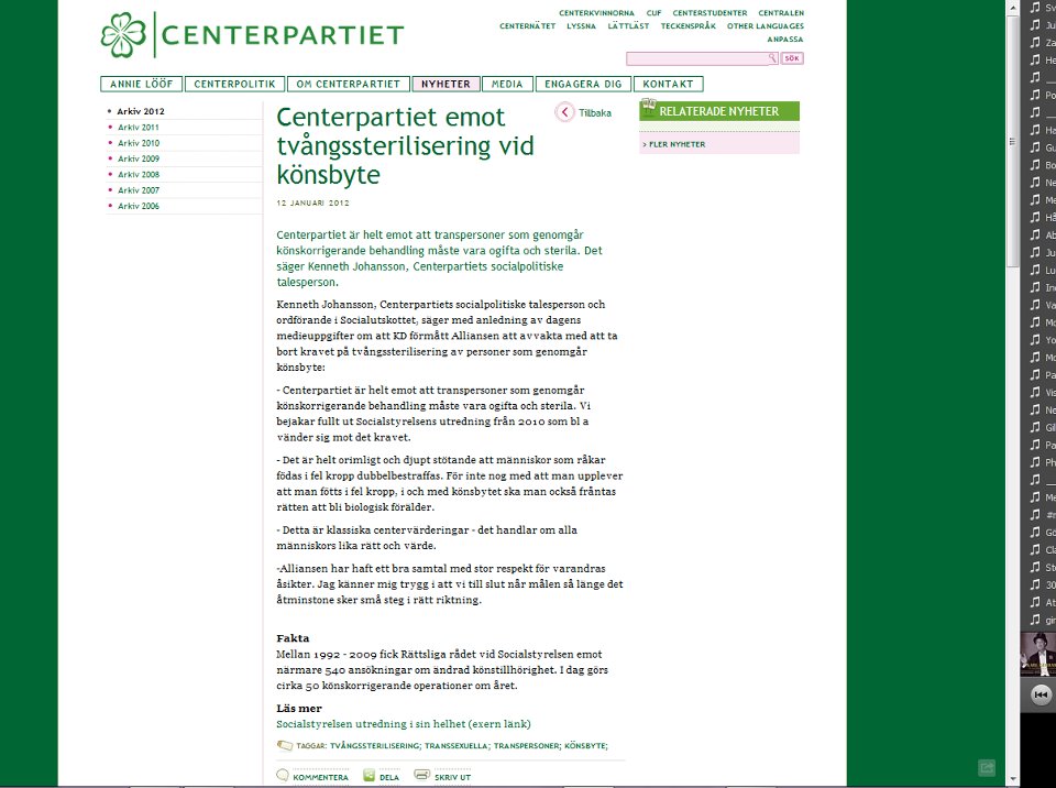 TVÅNGSSTERILISERINGAR Idag kom beskedet att Alliansen böjt sig för Kristdemokraternas krav om tvångssteriliseringarna av transsexuella ska fortsätta. Detta trots att Socialdemokraterna, Moderaterna, Vänsterpartiet, Miljöpartiet, Folkpartiet och Centerpartiet vill avskaffa denna rashygieniska rest. Men samtidigt som nyheterna kom om att Centern vikt sig i denna fråga kunde man läsa att partiet tar avstånd från tvångssteriliseringarna på sin hemsida. Så här står det där: