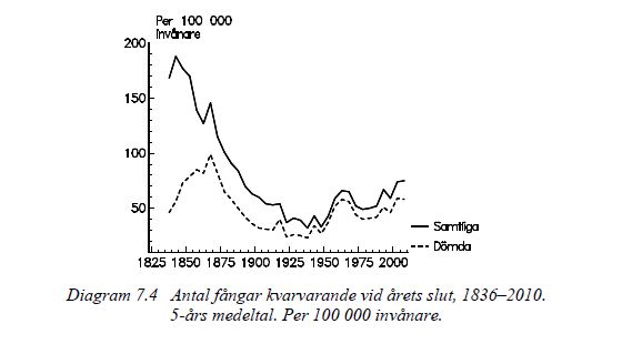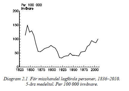 Sedan är det intressant att diagrammet ”för misshandel lagförda personer 1836-2010. Hårdare lagstiftning mot utskänkning av brännvin infördes på 1860-talet och myndigheter tvingade fram hårdare krav på såväl brännvinstillverkare som utskänkare vilket ledde till det så kallade ”brännvinskriget” på 1870-talet. Man kan i diagrammet se hur misshandelsdömds korrelerar med detta. Det sker sedan sakta en ökning och sedan en minskning i och med motbokens införande 1917.