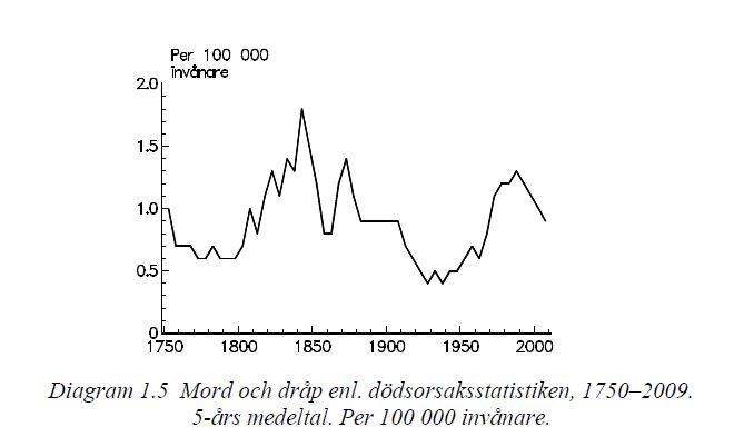 Statistiken över antalet mord per kapita visar att antalet mord ökade explosivt under 1800-talet, minskade för att öka igen, nästan lika dramatiskt från 40-talet och framåt. Efter det har antalet mord legat på ungefär samma nivå sen ca 1975.