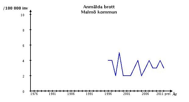 Du jämför internationellt. Sedan skriver du ”Hur ser det ut i Malmö då? Samma mönster. Iallafall enligt BRÅ:s statistik som sträcker sig 15 år bakåt i tiden ser det ut så här.” och visar ett diagram över ANMÄLDA BROTT. Om du inte vill anklagas för att blanda äpplen och päron (eller apelsiner eller vad som helst) så borde väl i rimlighetens namn antal mord i Malmö redovisas. Där kan man troligtvis gå längre tillbaka än 15 år.