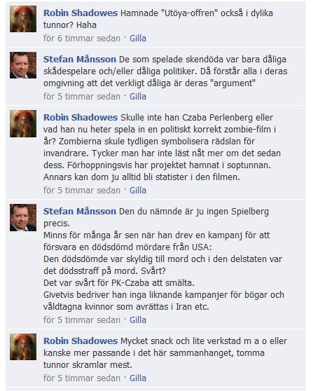 Bland deltagarna i denna diskussion hittar vi Carina Herrstedt, sverigedemokratisk riksdagskvinna från Landskrona, och hennes vän sverigedemokraten Stafen Månsson. Stefan var nr. 24 på sverigedemokraternas kommunlista i Landskrona under valet 2010, han är mer känd under pseudonymen Uncle Bob. Jag har sen tidigare haft den tvivelaktiga äran att avslöja saker han gjort. (Lär mer här och här!)
